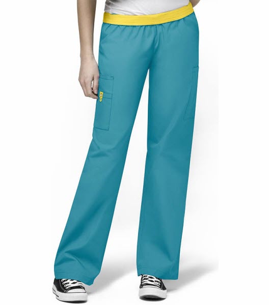 Women's Modern Fit. 65/35 Polyester/Cotton. Full elastic waistband that can me worn flipped down. Two front pockets including one WonderWink signature triple pocket with hidden mesh cell phone pocket. Signature ID bungee loop. Size Medium leg opening 9.5"